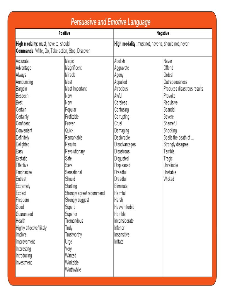 Explore the magic of emotive language and how it can enhance the quality of your writing by many notches. Emotive language will be used for the purpose of dealing with the understanding of the mindset and background of the people and things which are part of the details of the story. … you're looking to add some emotive language to your aresenal, bushra azhar has a great list of emotive words grouped by the emotion you're trying to. Emotive language and emotional appeal have the same goal: Now you might wonder what could possibly be the emotive language definition.